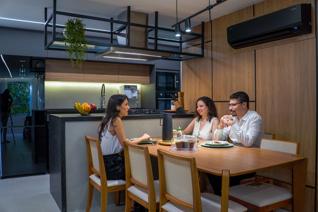 Para integrar sala e cozinha, temos um painel em marcenaria com uma porta mimetizada, que separa o ambiente social da área íntima do apartamento, dando privacidade e conforto. Um ponto interessante é a escolha do ar condicionado, com acabamento preto, para compor com os perfis de alumínio pretos da Alternativa Componentes.