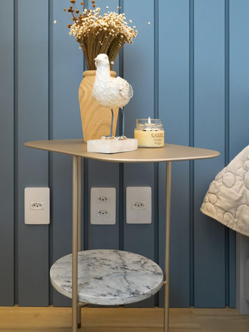 Já no quarto de hóspedes, a parede foi pintada com a cor meditação da Suvinil e a cortina escolhida foi a de tecido com semi-blackout, trazendo conforto e elegância. Instalamos uma linda luminária de parede ao lado da cama e a marcenaria personalizada da Florense também apareceu por aqui, sendo um destaque a cabeceira com bites a cada 10cm. O mobiliário solto também foi destaque, com uma linda mesa de canto da Líder em lacca fendi e prateleira em mármore carrara.